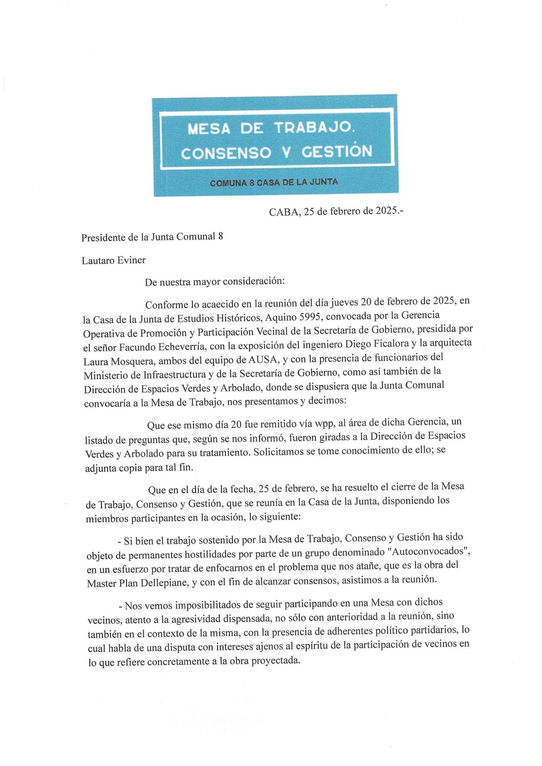 Recepción de nota de cierre de Mesa de Trabajo, Consenso y Gestión C8 en la Casa de la Junta con adjuntos oportunamente enviados a la Secretaria de Gobierno.
